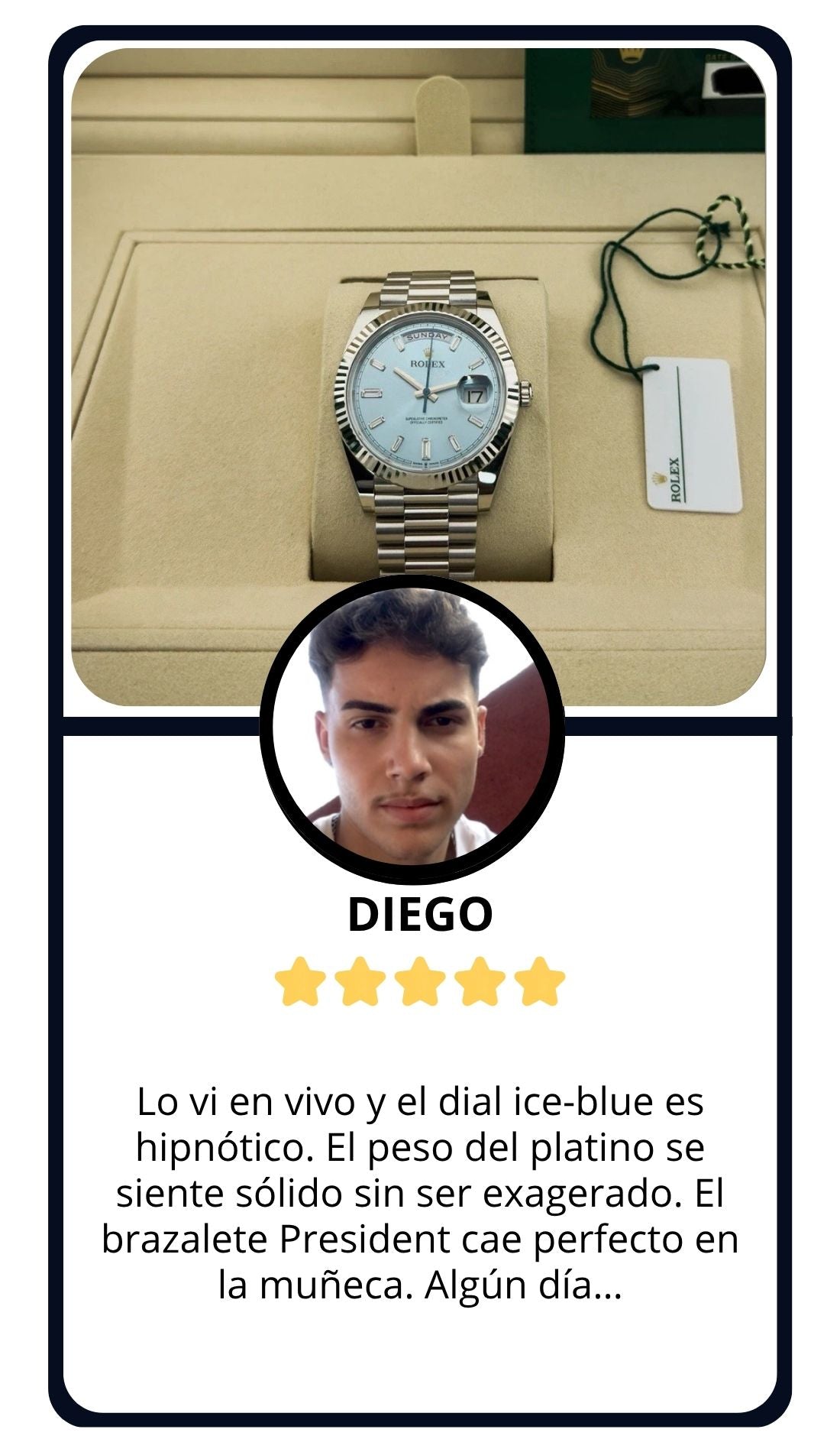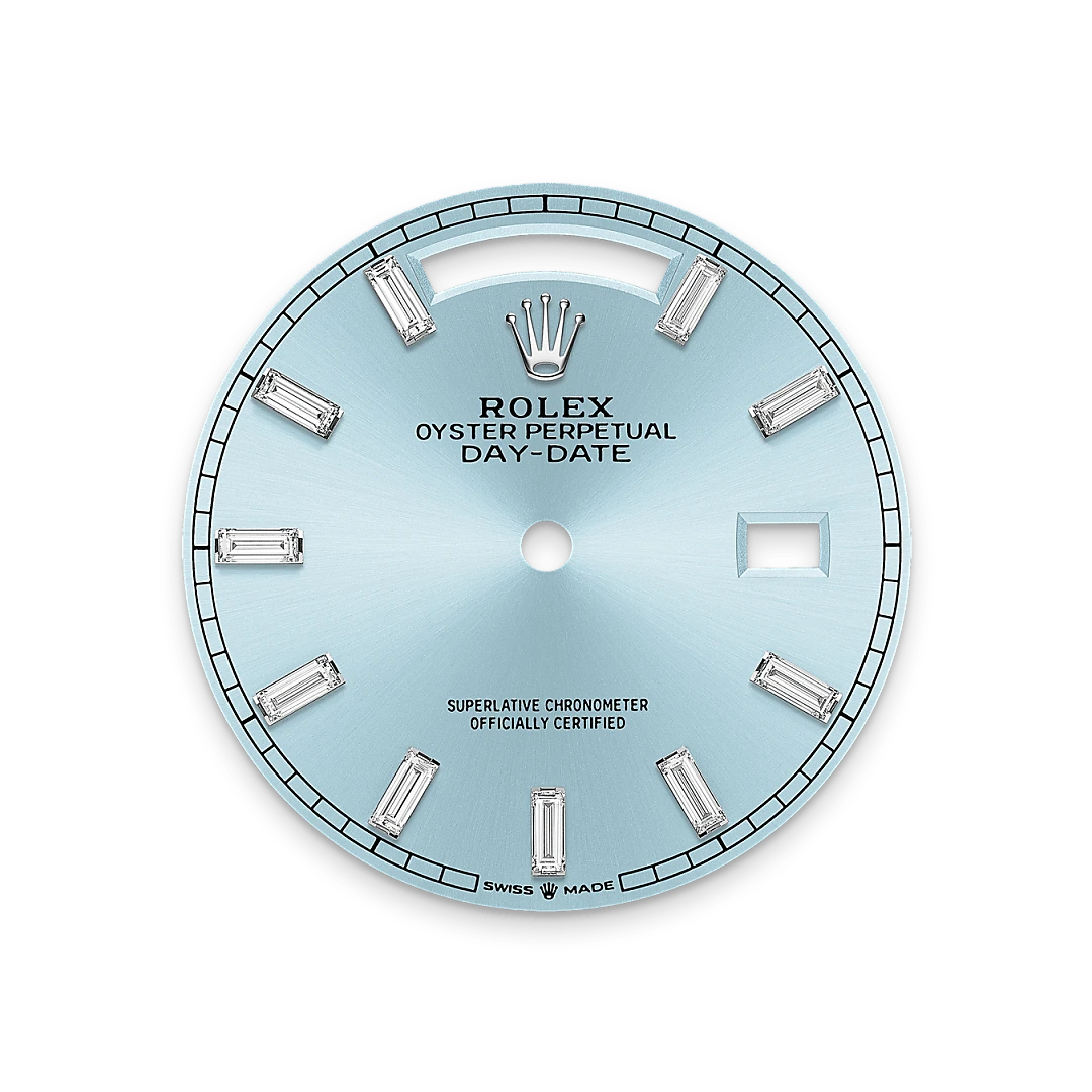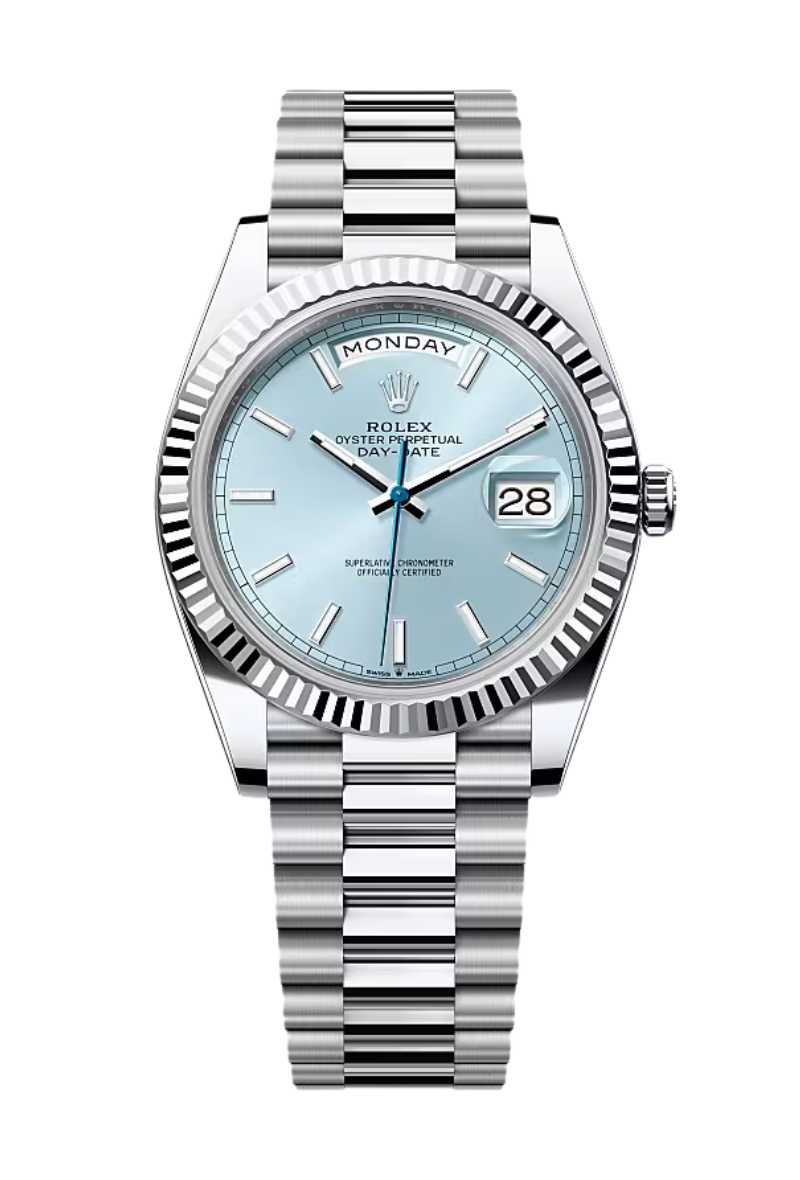 Oyster Perpetual Day-Date 40 en platino, con esfera azul glaciar, bisel estriado y brazalete President.
